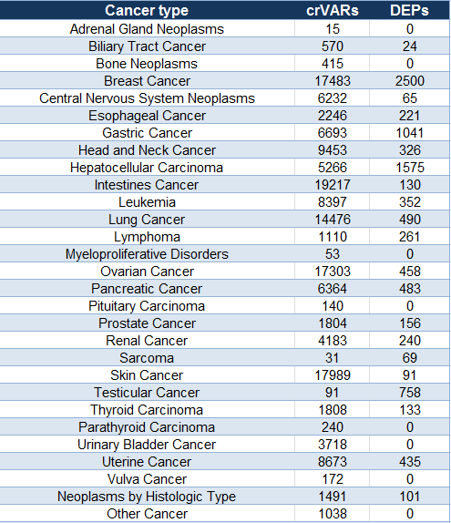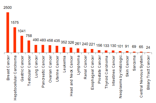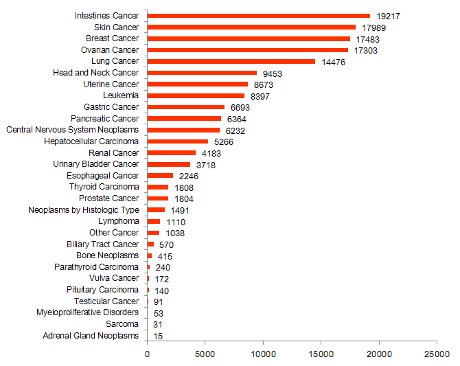 Cancer type The cancer type are as follows: Adrenal Gland Neoplasms; Biliary Tract Cancer; Breast Cancer(breast ductal carcinoma); Central Nervous System Neoplasms(Brain Cancer); Esophageal Cancer; Gastric Cancer; Head and Neck Cancer(Oral Cancer; Oral Premalignant Lesions); Hepatocellular Carcinoma(hepatitis C virus; hepatitis B virus); Intestines Cancer(Colorectal Cancer); Leukemia(chronic myeloid leukemia; chronic lymphocytic leukemia; acute myeloid leukemia; acute lymphocytic leukemia); Lung Cancer(Non-small cell lung carcinoma; Small cell lung carcinoma); Lymphoma; Myeloproliferative Disorders; Ovarian Cancer; Pancreatic Cancer(pancreatic ductal adenocarcinoma); Pituitary Carcinoma; Prostate Cancer; Renal Cancer; Sarcoma; Skin Cancer(Melanoma; Nonmelanoma); Testicular Cancer; Thyroid Carcinoma(papillary thyroid carcinoma; follicular thyroid carcinoma; follicular thyroid adenoma); Urinary Bladder Cancer; Uterine Cancer; Neoplasms by Histologic Type; Other Cancer.